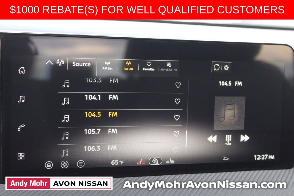 - Radio: AM/FM/SiriusXM Audio System -inc: 12.3" color touchscreen display w/6 speakers, Bluetooth® hands-free phone system, streaming audio via Bluetooth®, NissanConnect Services powered by SiriusXM featuring wireless Apple CarPlay, wireless Android Auto, Siri eyes free and hands-free text messaging assistant, audio and Bluetooth® steering wheel switches and Wi-Fi hotspot