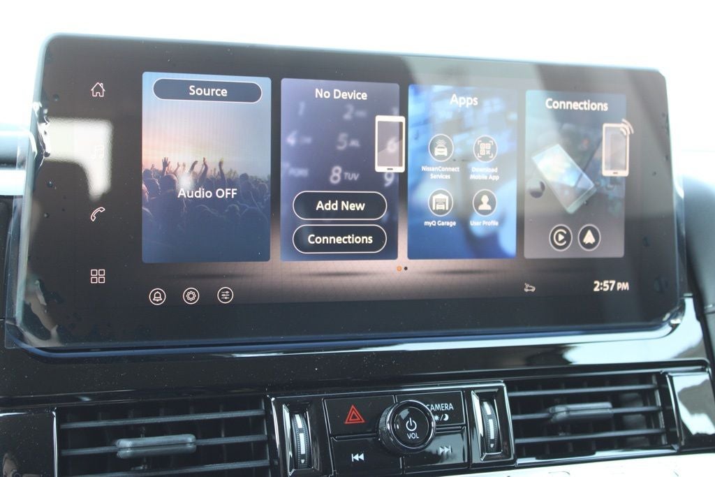 - Radio: AM/FM Audio System w/NissanConnect -inc: 6 speakers, 5G Wi-Fi hotspot, wireless Apple CarPlay and Android Auto, 12.3" multi-function information display, SiriusXM satellite radio, 2 front USB connection (1 type C charge and data ports), Bluetooth® hands-free phone system, streaming audio and messaging and hands-free text messaging assistant