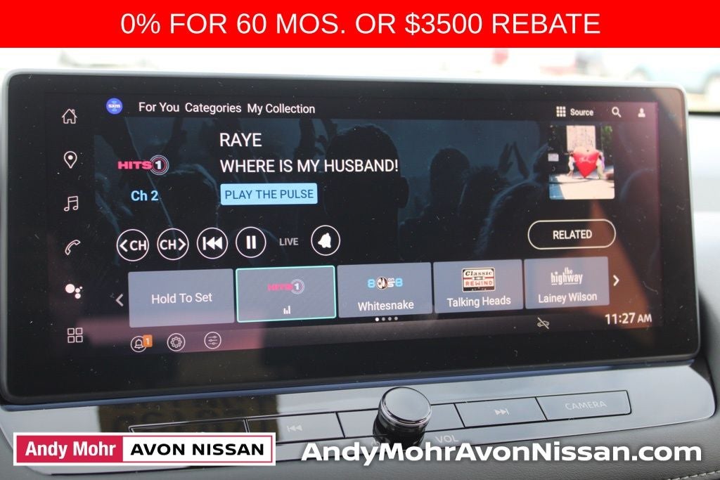 - Radio: AM/FM NissanConnect w/Navigation -inc: SiriusXM 360L, hybrid radio, enhanced voice recognition (one shot VDE, natural language understanding), Active Noise Cancellation, wireless Apple CarPlay, wireless Android Auto, 12.3" color HD display, Bluetooth®, 2 front USB type-C, Wi-Fi hotspot, Alexa Built-In, Google built-in: Google Assistant, Play Store, maps, data, NissanConnect Services powered by SiriusXM, SiriusXM Traffic and SiriusXM Travel Link