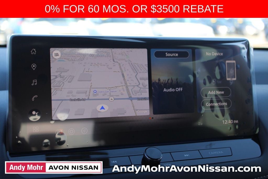 - Radio: AM/FM NissanConnect w/Navigation -inc: SiriusXM 360L, hybrid radio, enhanced voice recognition (one shot VDE, natural language understanding), Active Noise Cancellation, wireless Apple CarPlay, wireless Android Auto, 12.3" color HD display, Bluetooth®, 2 front USB type-C, Wi-Fi hotspot, Alexa Built-In, Google built-in: Google Assistant, Play Store, maps, data, NissanConnect Services powered by SiriusXM, SiriusXM Traffic and SiriusXM Travel Link