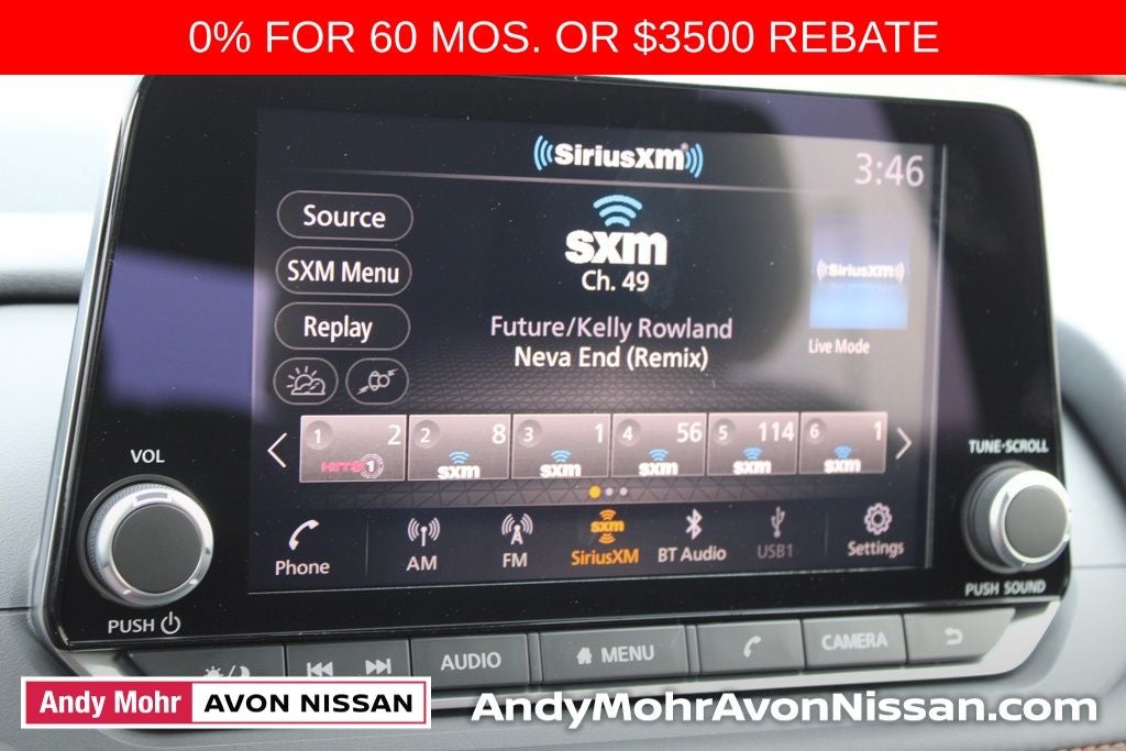 - Radio: AM/FM NissanConnect -inc: 6 speakers plus 2 tweeters, Apple CarPlay, Android Auto, 8" color touch screen display, Bluetooth®, 2 front USB type-C, Wi-Fi hotspot and NissanConnect Services powered by SiriusXM