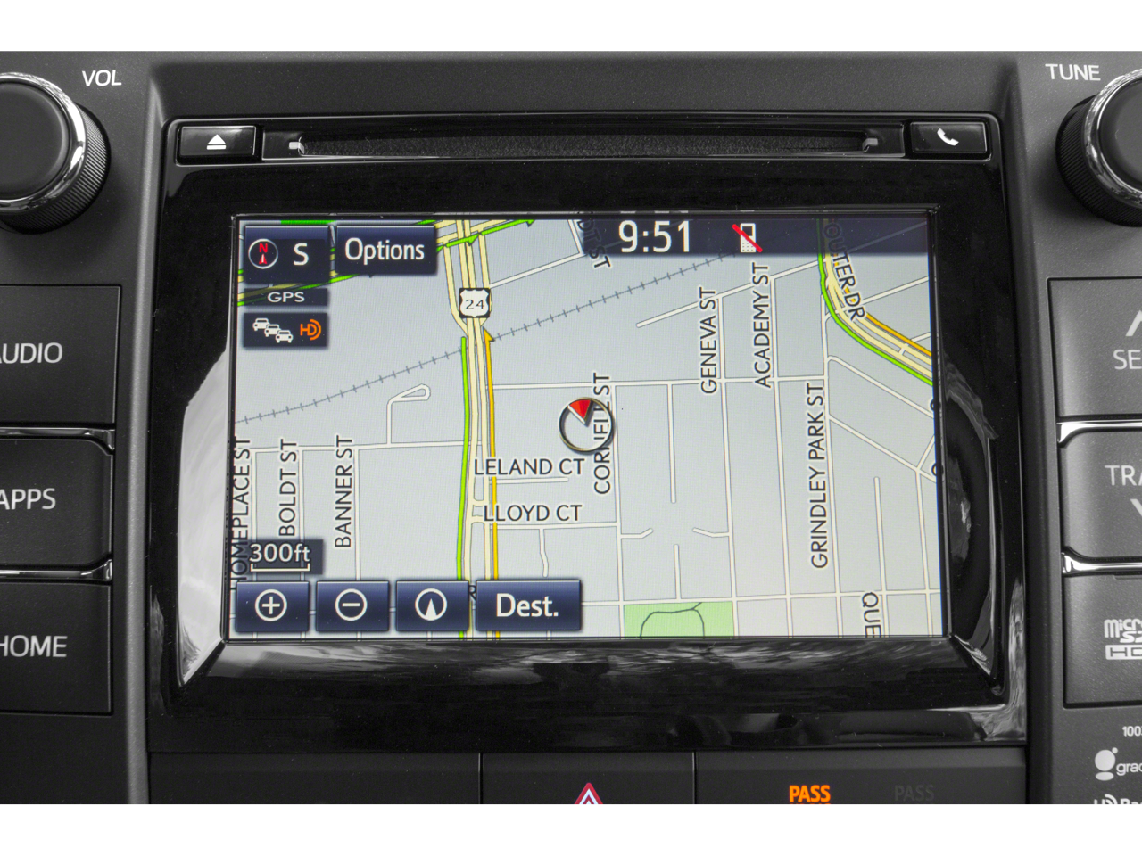 - Radio: Entune Premium Audio w/Navigation/App Suite -inc: Entune multimedia bundle, 7" high-resolution touch-screen display, AM/FM CD player, MP3/WMA playback capability, 6 speakers, auxiliary audio jack, USB 2.0 port w/iPod connectivity and control, advanced voice recognition, hands-free phone capability, phone book access and music streaming via Bluetooth® wireless technology, Entune app suite, HD Radio, HD predictive traffic and doppler weather overlay, AM/FM cache radio and SiriusXM radio w/90-day complimentary trial, Entune app suite includes Bing, Facebook Places, iHeartRadio, MovieTickets.com, Open Table, Pandora and Yelp, real-time info including traffic, weather, fuel prices, sports and stocks, Access to Entune services is free, See Toyota.com/entune for details