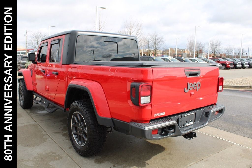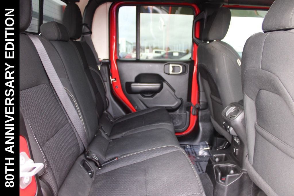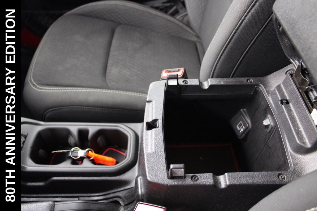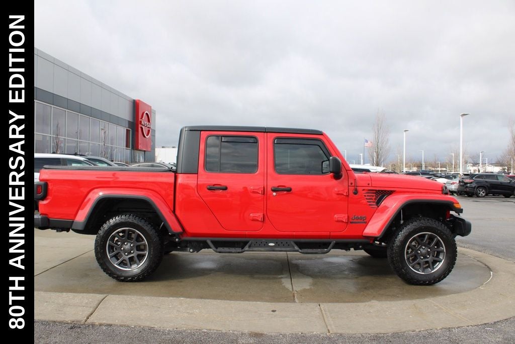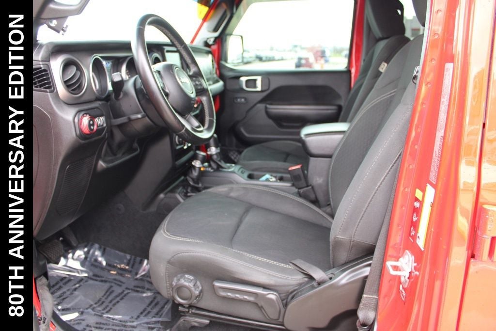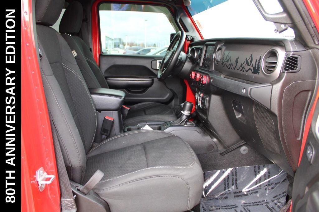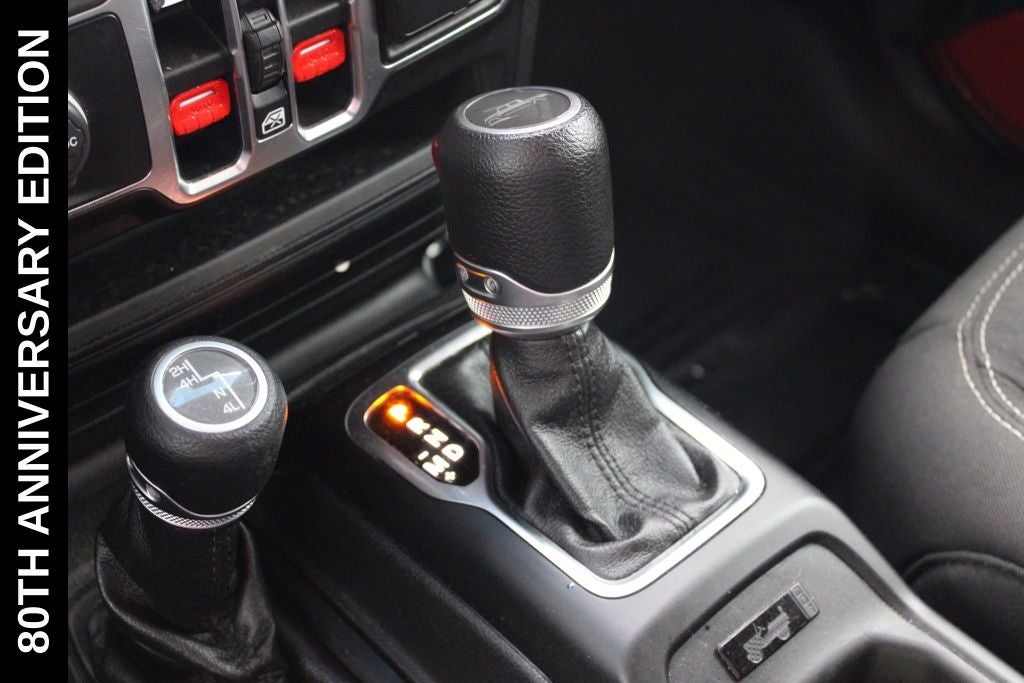 Exterior-wise, this Jeep Gladiator Sport stands out with its striking Firecracker Red Clearcoat paint, complemented by the bold body-color fender flares and grille. The 80th Anniversary edition badges and accents add a touch of exclusivity and style.