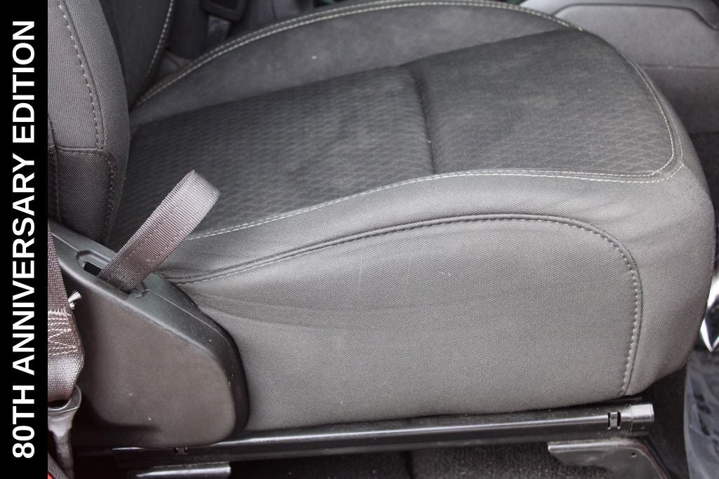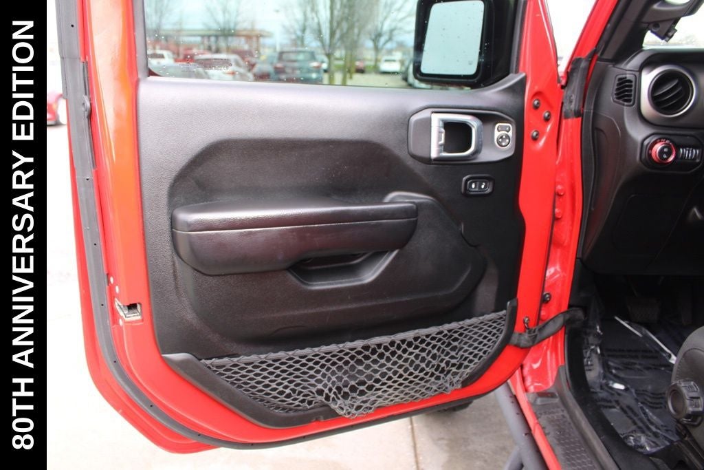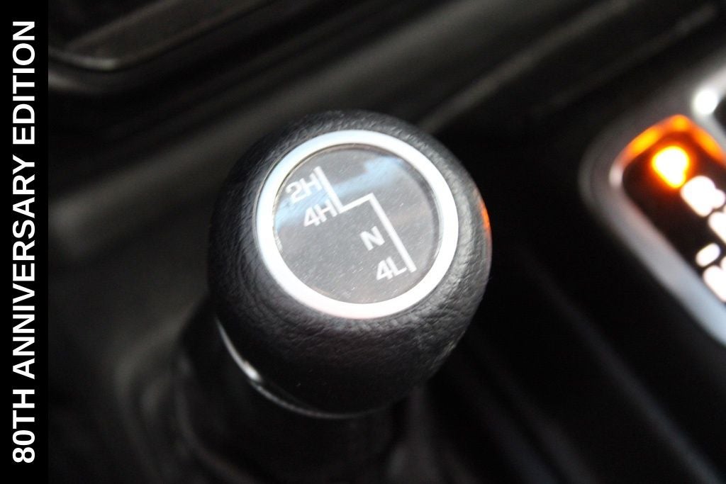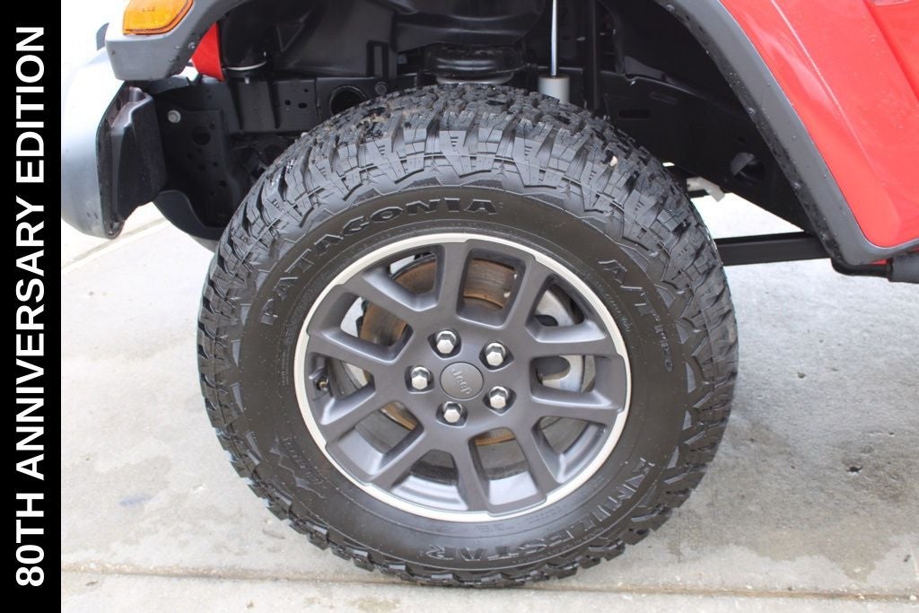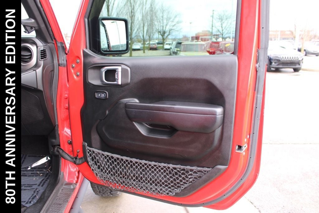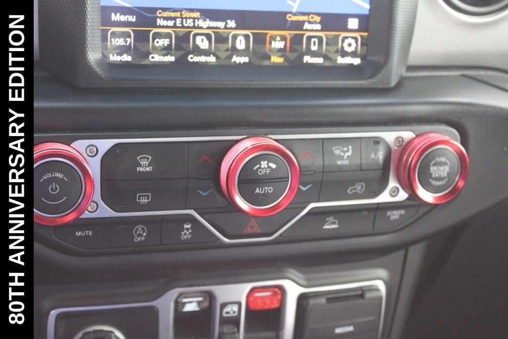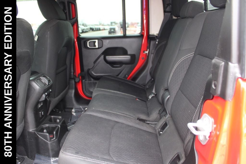Exterior-wise, this Jeep Gladiator Sport stands out with its striking Firecracker Red Clearcoat paint, complemented by the bold body-color fender flares and grille. The 80th Anniversary edition badges and accents add a touch of exclusivity and style.