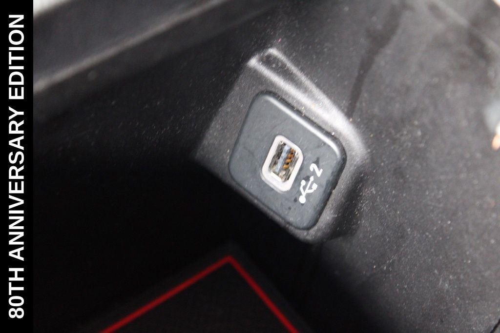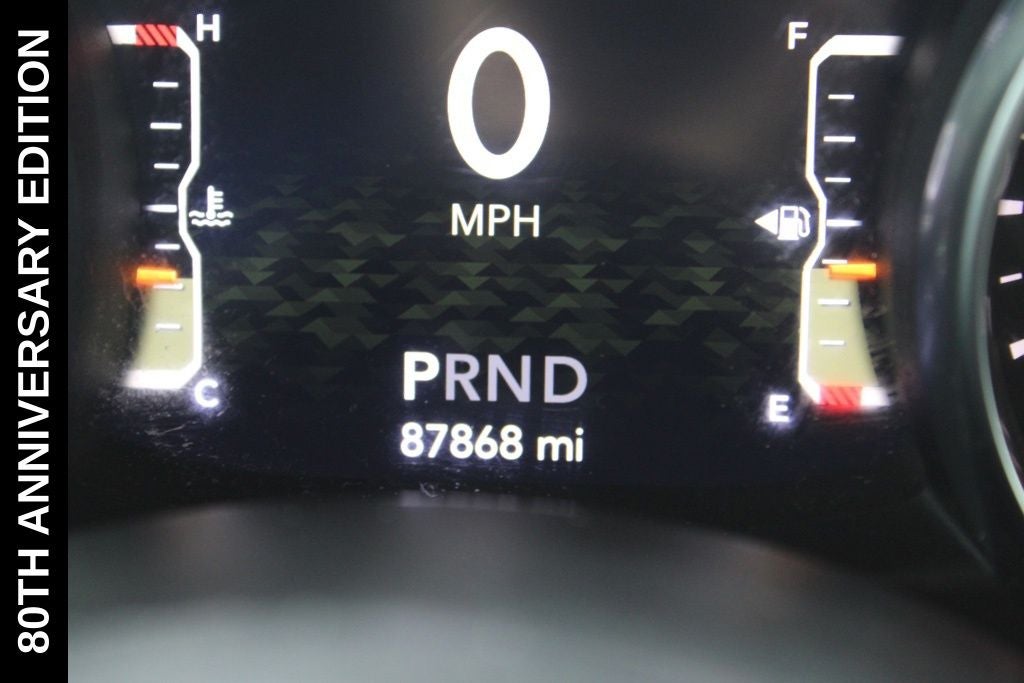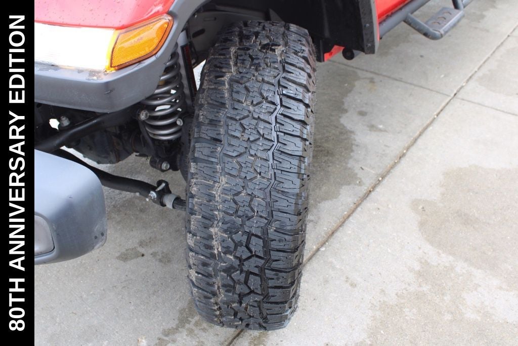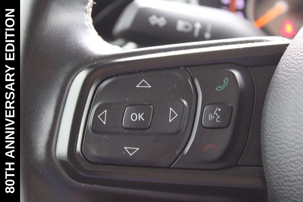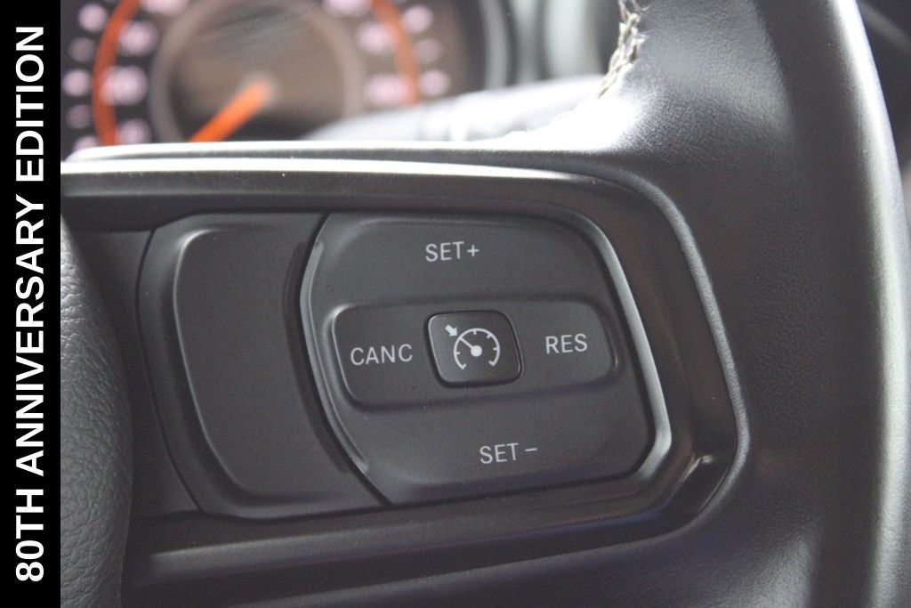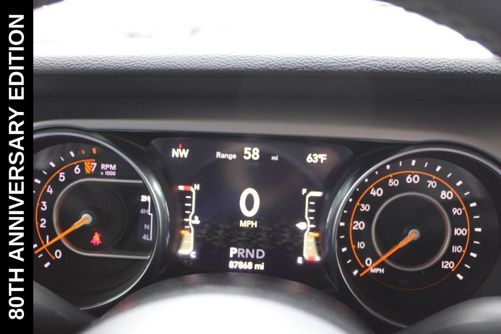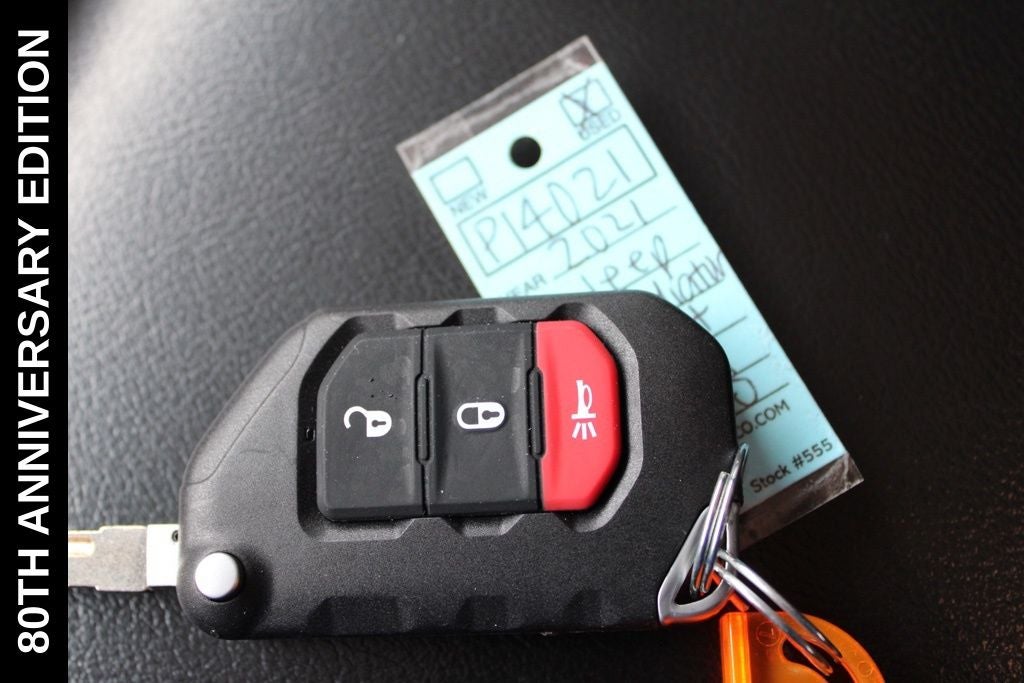 Exterior-wise, this Jeep Gladiator Sport stands out with its striking Firecracker Red Clearcoat paint, complemented by the bold body-color fender flares and grille. The 80th Anniversary edition badges and accents add a touch of exclusivity and style.