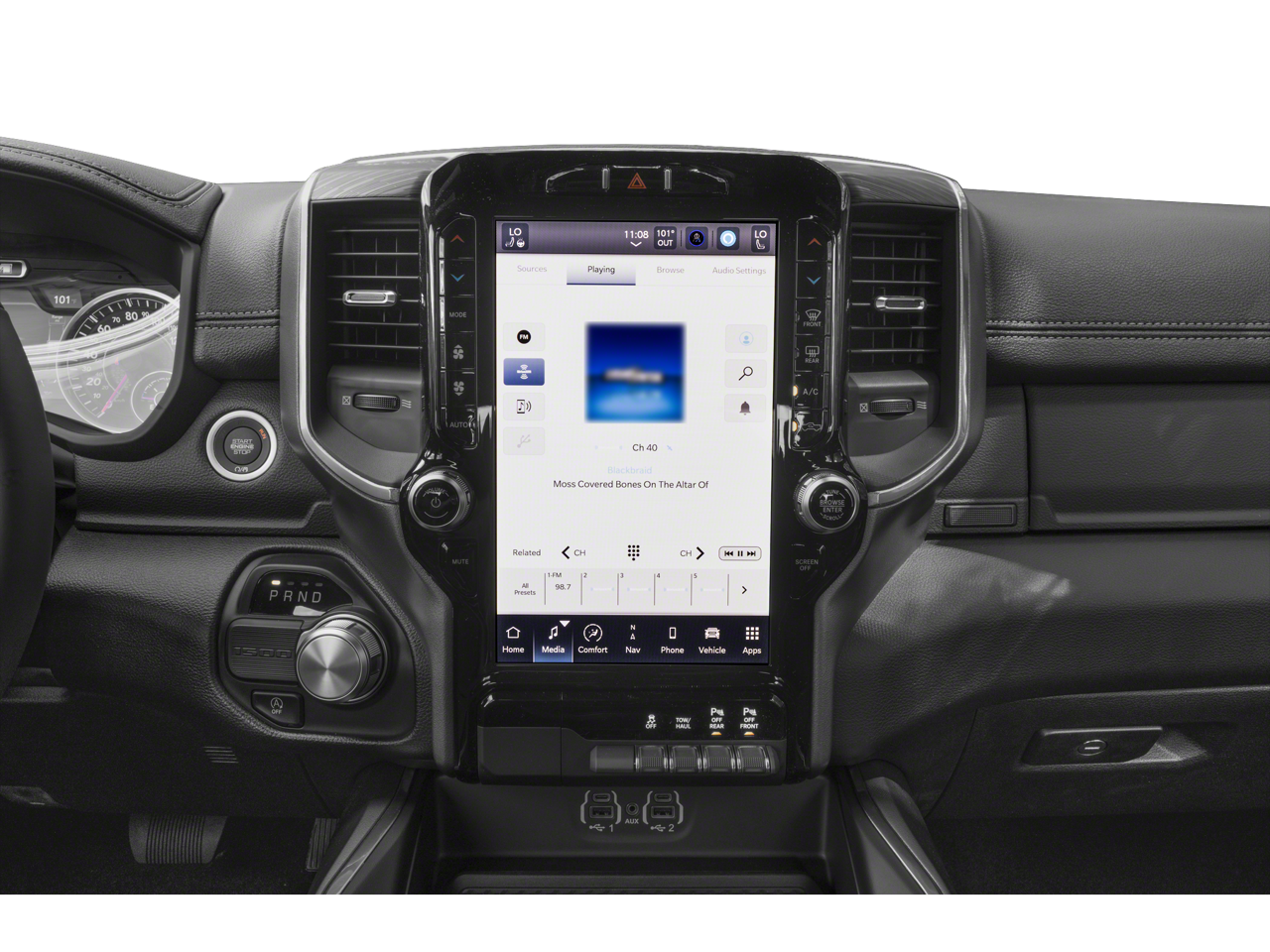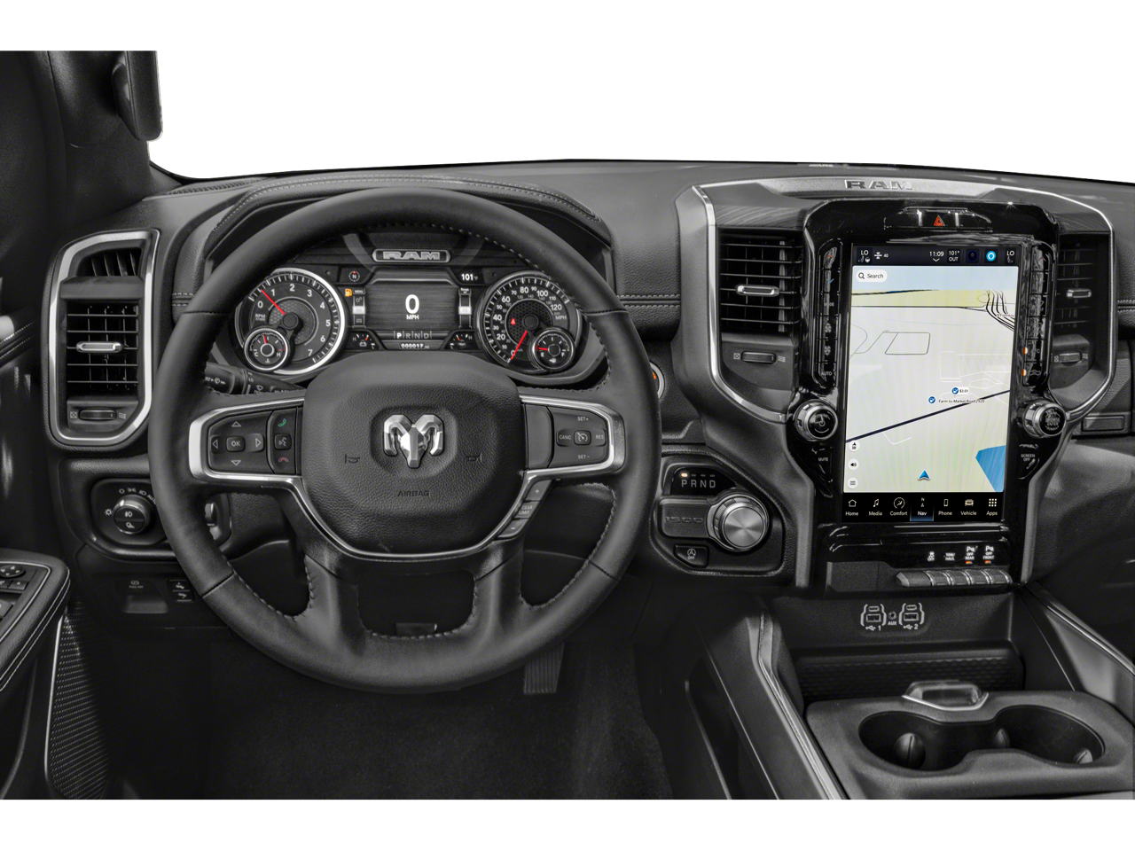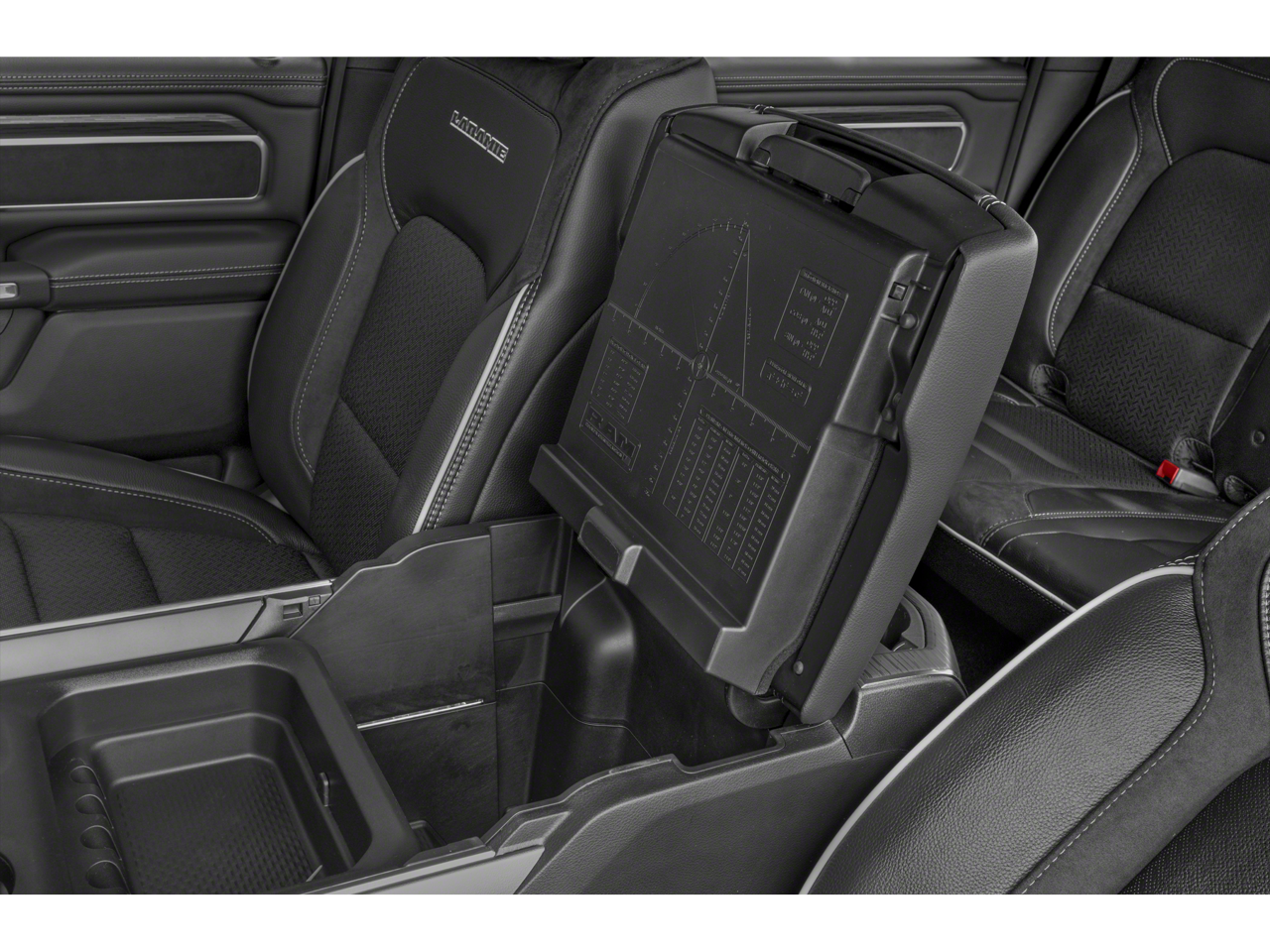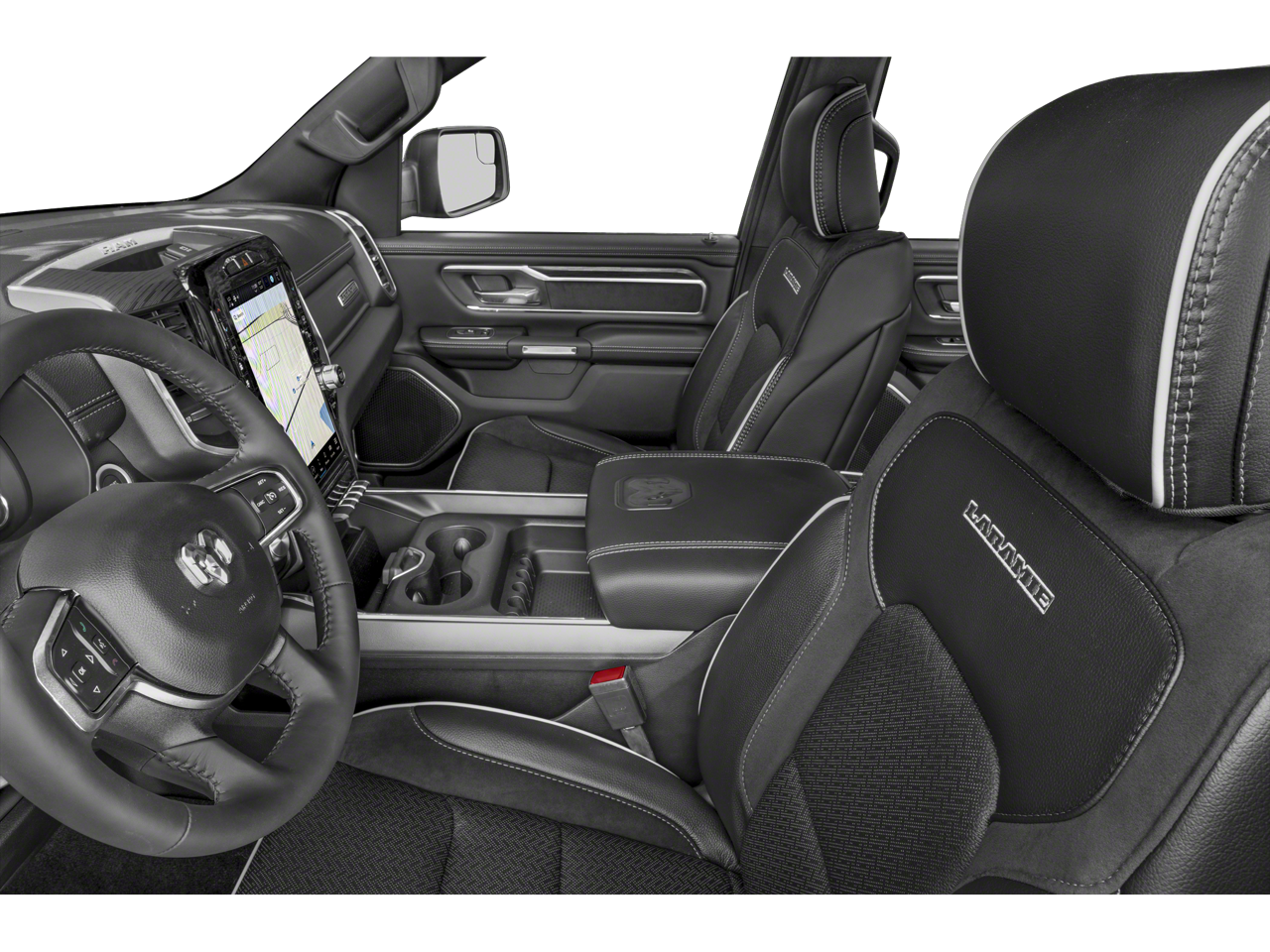 - GPS Antenna Input, harman/kardon 19 Speaker Premium Sound, HD Radio, Integrated Center Stack Radio, Radio: Uconnect 5 Nav w/12.0 Display, SiriusXM Radio Service, SiriusXM w/360L, Body Color Front Bumper, Rear Window Defroster, Driver Seat Memory, Exterior Mirrors w/Memory, Rear 60/40 Folding Seat, Rear Power Sliding Window, Blind Spot & Cross Path Detection, Black Headlamp Bezels, Electric Shift-On-Demand Transfer Case, Accent Color Door Handles, Accent Color Premium Power Mirrors, Auto High Beam Headlamp Control, Auto-Dimming Exterior Driver Mirror, Black Exterior Truck Badging, Black Painted Exterior Mirrors Caps, Convex Wide-Angle Exterior Mirror Insert, Dual Exhaust w/Black Tips, Exterior Mirrors Courtesy Lamps, Exterior Mirrors w/Heating Element, Exterior Mirrors w/Supplemental Signals, Front LED Fog Lamps, Grille Surround 3 Black Texture 2 Black, LED Reflector Headlamps, Power-Folding Mirrors, RAM Grille Badge - Black, Sport Performance Hood, USB Host Flip, #1 Seat Foam Cushion, 12 Touchscreen Display, 2nd Row In Floor Storage Bins, 4G LTE Wi-Fi Hot Spot, Apple CarPlay, Black Interior Accents, Center Console Parts Module, Connected Travel & Traffic Services, Connectivity - US/Canada, Disassociated Touchscreen Display, Foam Bottle Insert (Door Trim Panel), Front Door Accent Lighting, Full Length Upgraded Floor Console, Global Telematics Box Module (TBM), Google Android Auto, Heated Steering Wheel, Integrated Voice Command w/Bluetooth®, ParkSense Front/Rear Park Assist w/Stop, Rear Door Accent Lighting, GPS Navigation, Navigation System, Body Color Rear Bumper w/Step Pads, Remote Tailgate Release, 3 Rear Seat Head Restraints, 4 Way Front Headrests, Bucket Seats, Heated Front Seats, Leather Trimmed Bucket Seats, Power 2-Way Driver Lumbar Adjust, Power 2-Way Passenger Lumbar Adjust, Power 8-Way Driver & Passenger Seats, Ventilated Front Seats, Front Seat Back Map Pockets, Rear Underseat Compartment Storage, Wheels: 22 x 9 Forged Aluminum, Rain Sensitive Windshield Wipers